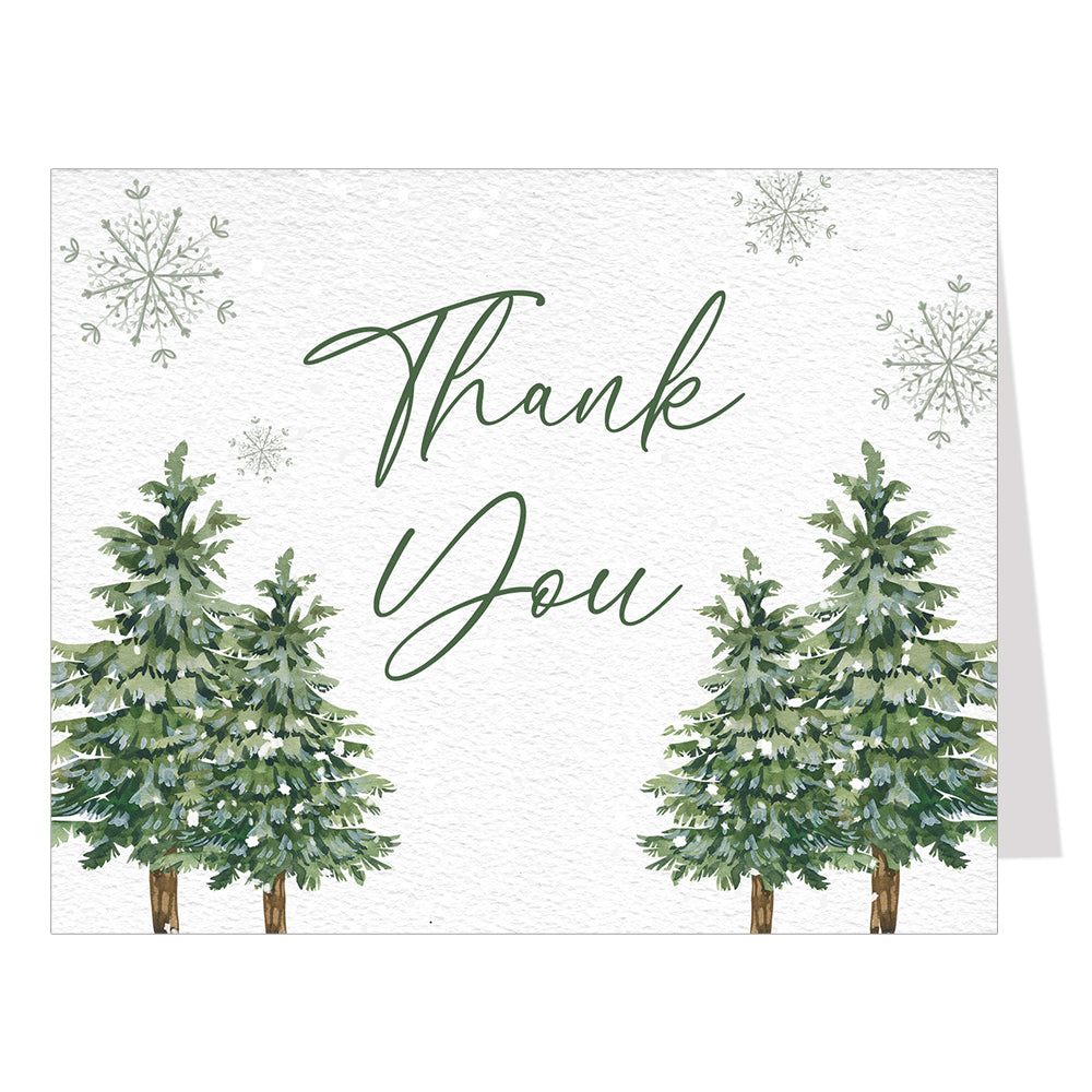 Thank guests for attending your baby shower with this beautiful card featuring winter trees and snowflakes.