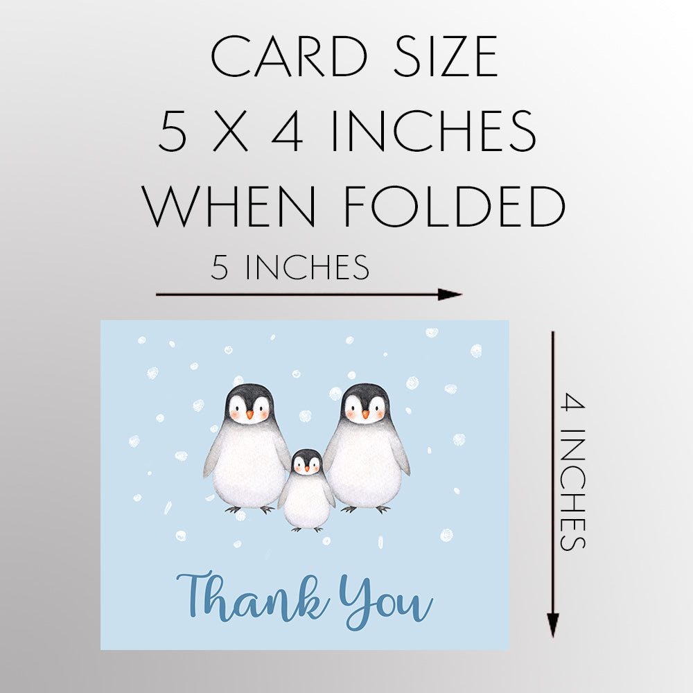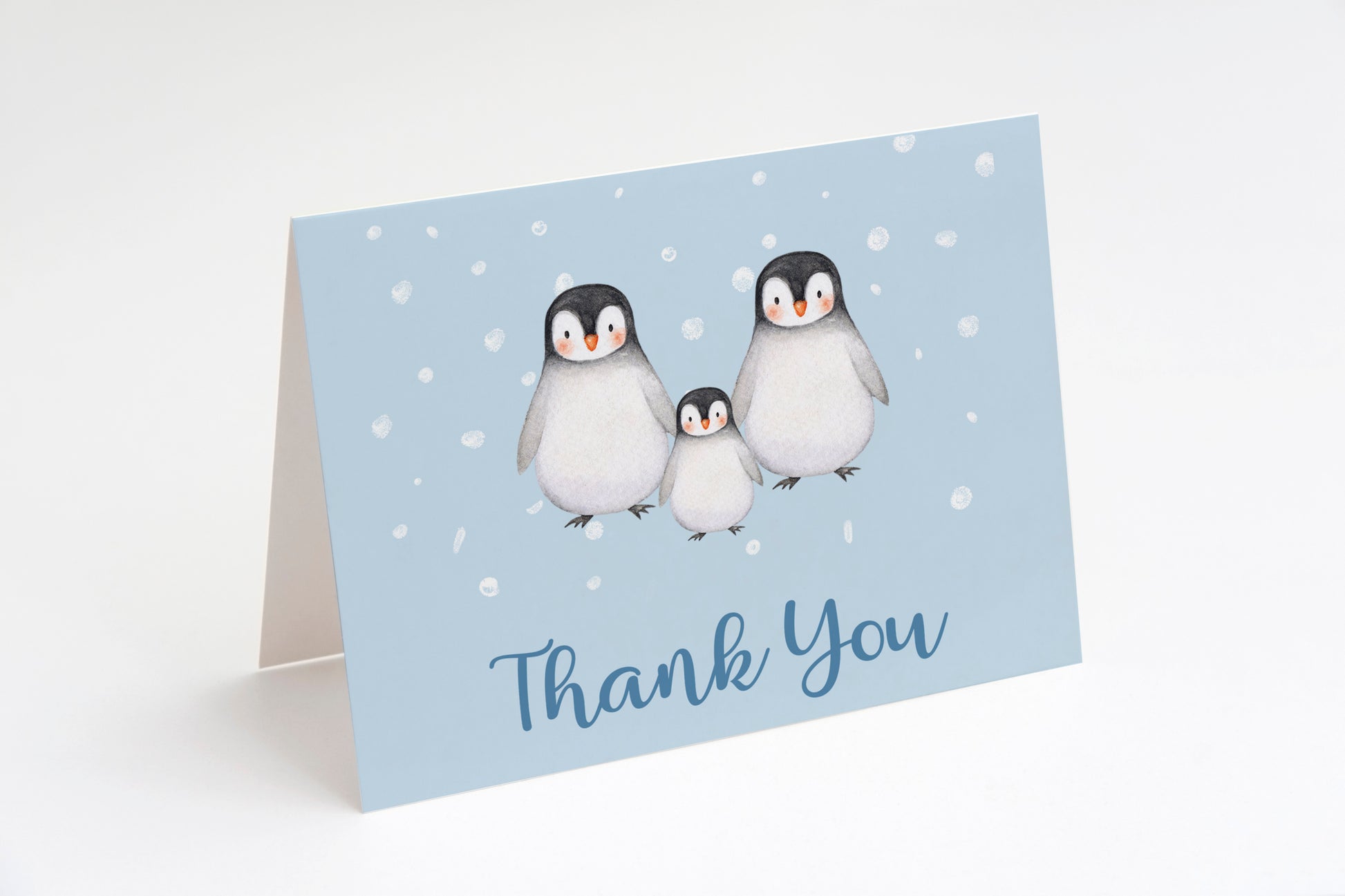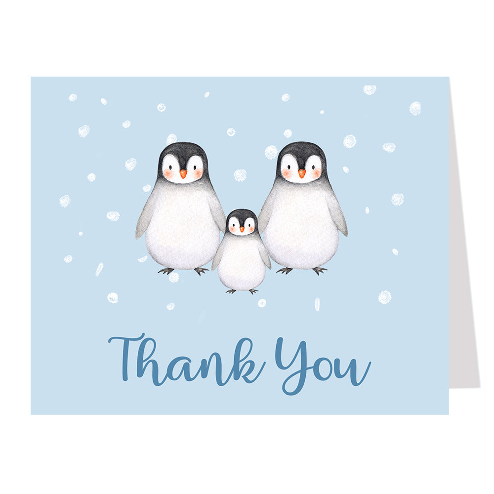 Thank guests for coming to your event with this adorable card featuring two big penguins and a baby penguin on a snowy backdrop.