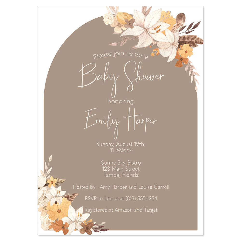 Invite guests to your baby shower with this bohemian invitation featuring a beige arch and neutral florals.