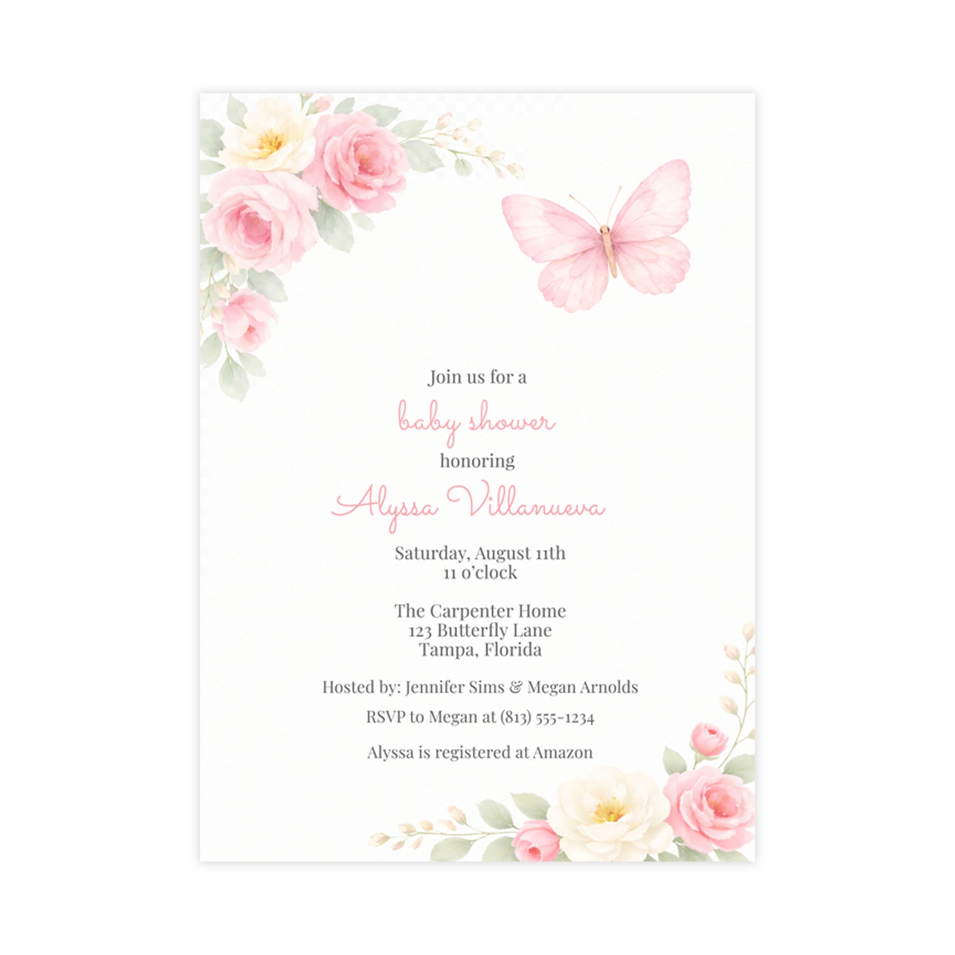 Invite guests to your baby shower with this beautiful card featuring watercolor butterflies and florals.