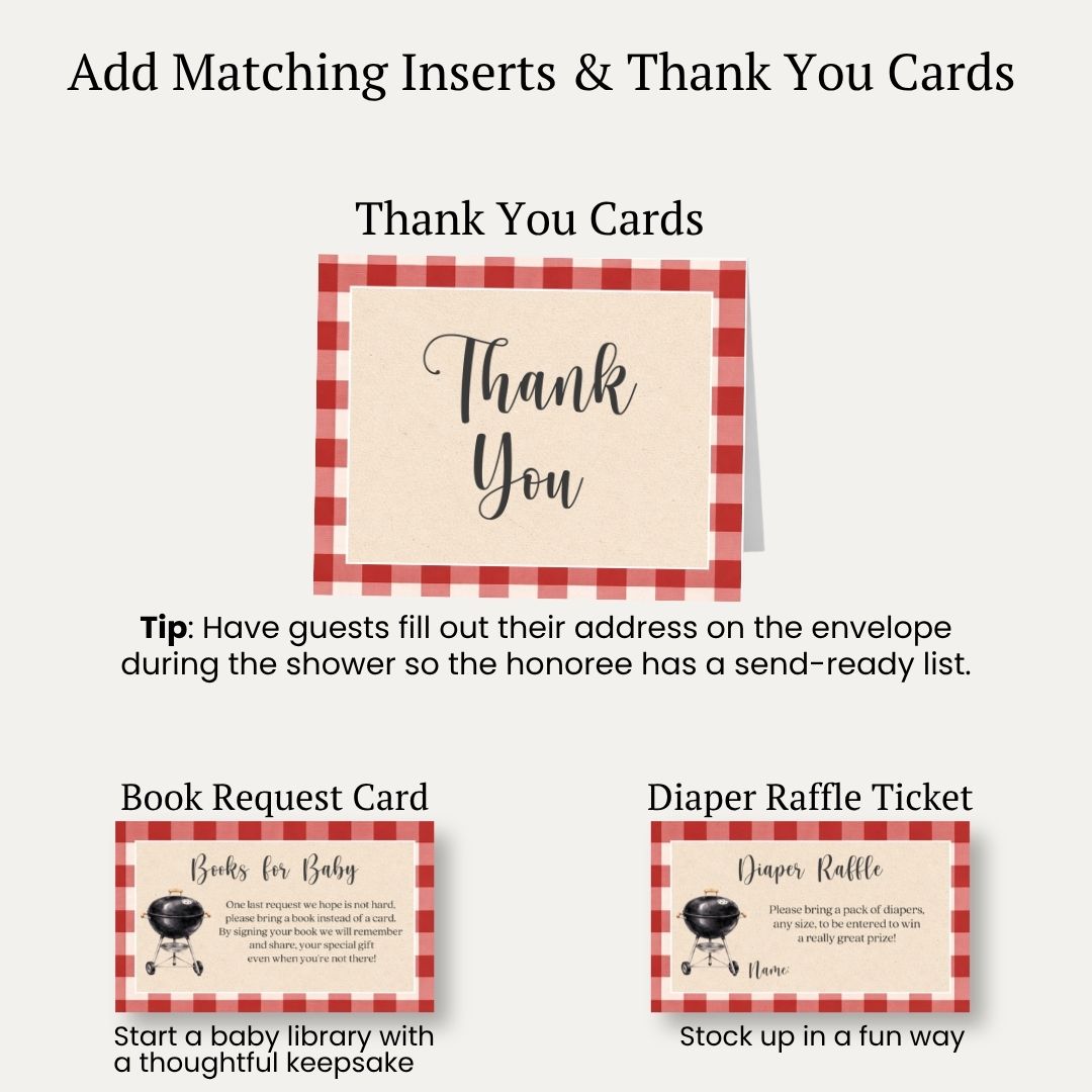 This baby shower invitation is created for a baby shower celebration and features a barbecue grill theme. The artwork includes a grill set against a red gingham pattern on a kraft-style background, creating a relaxed backyard setting. This casual style works well for Baby-Q showers and pairs naturally with outdoor gatherings, cookouts, and park celebrations. White envelopes included with printed cards.