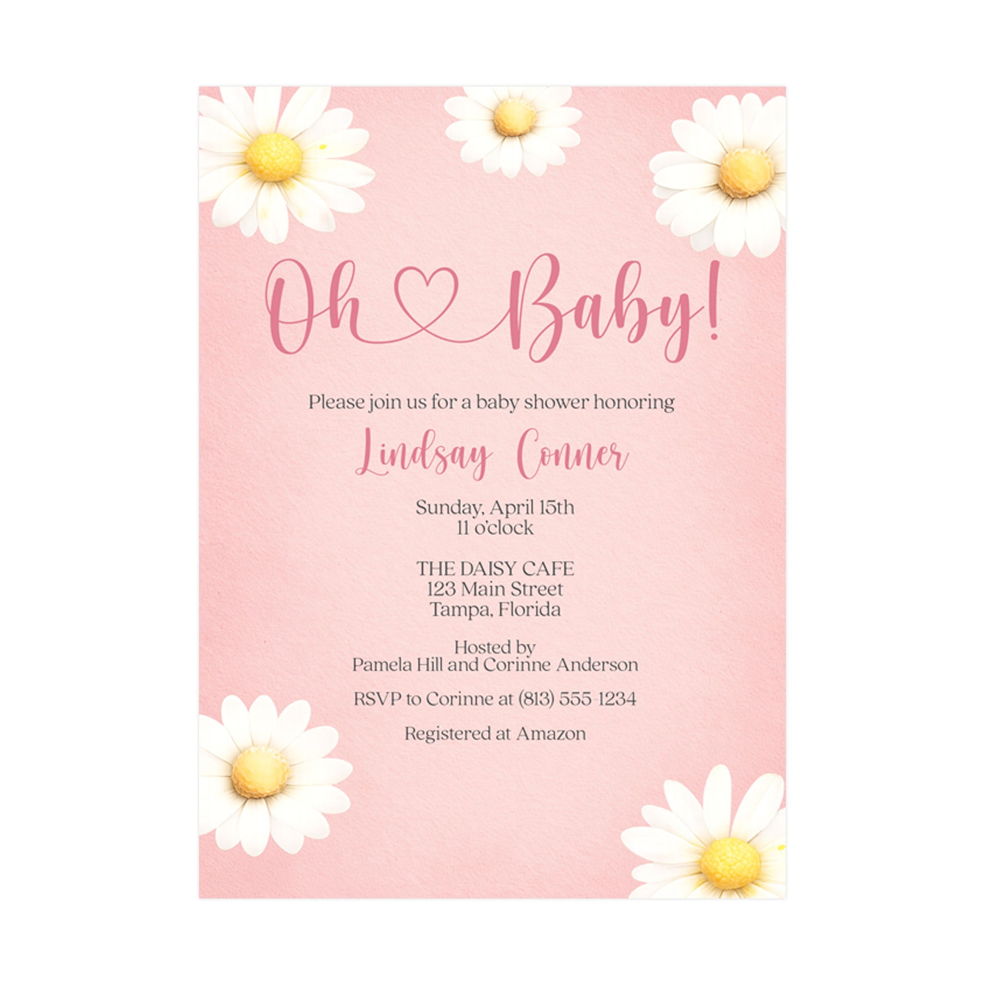 Invite guests to your upcoming baby shower with this adorable daisy invitation on a pink background.