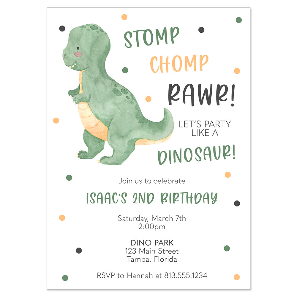 Invite guests to your child's birthday party with these fun invitation featuring a t-rex surrounded by polka dots.