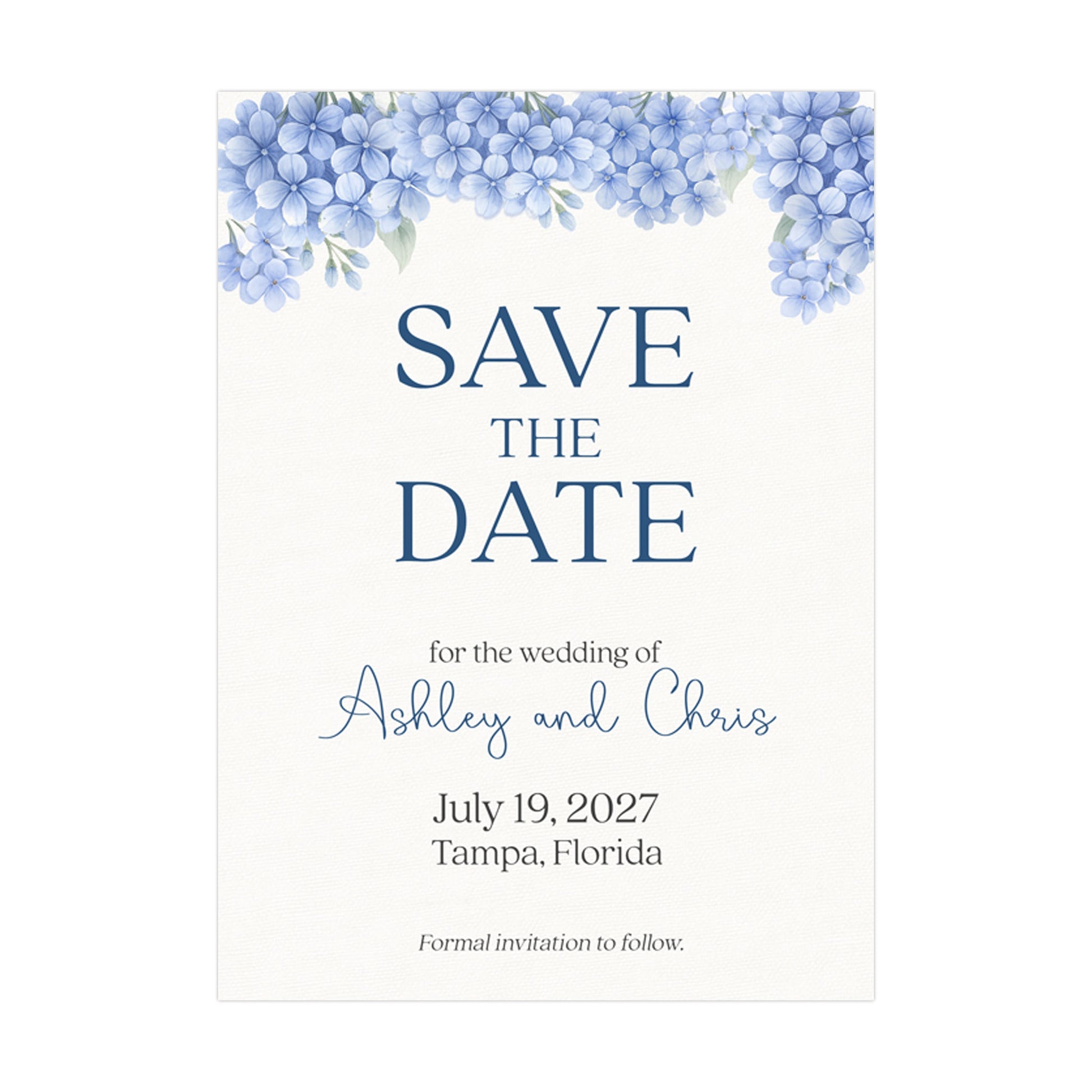 Have guests "save the date" for your wedding with this beautiful card, featuring blue watercolor hydrangea flowers!