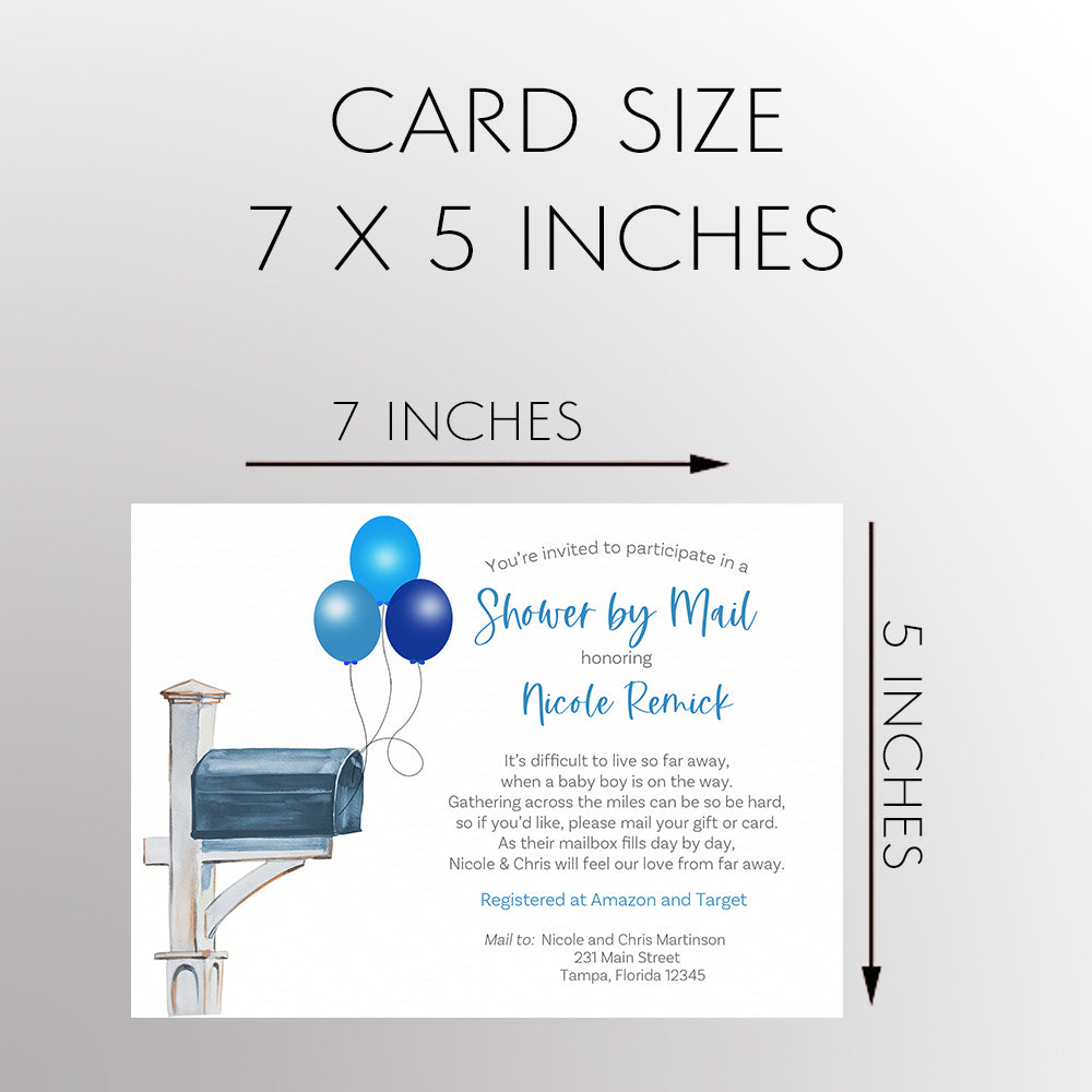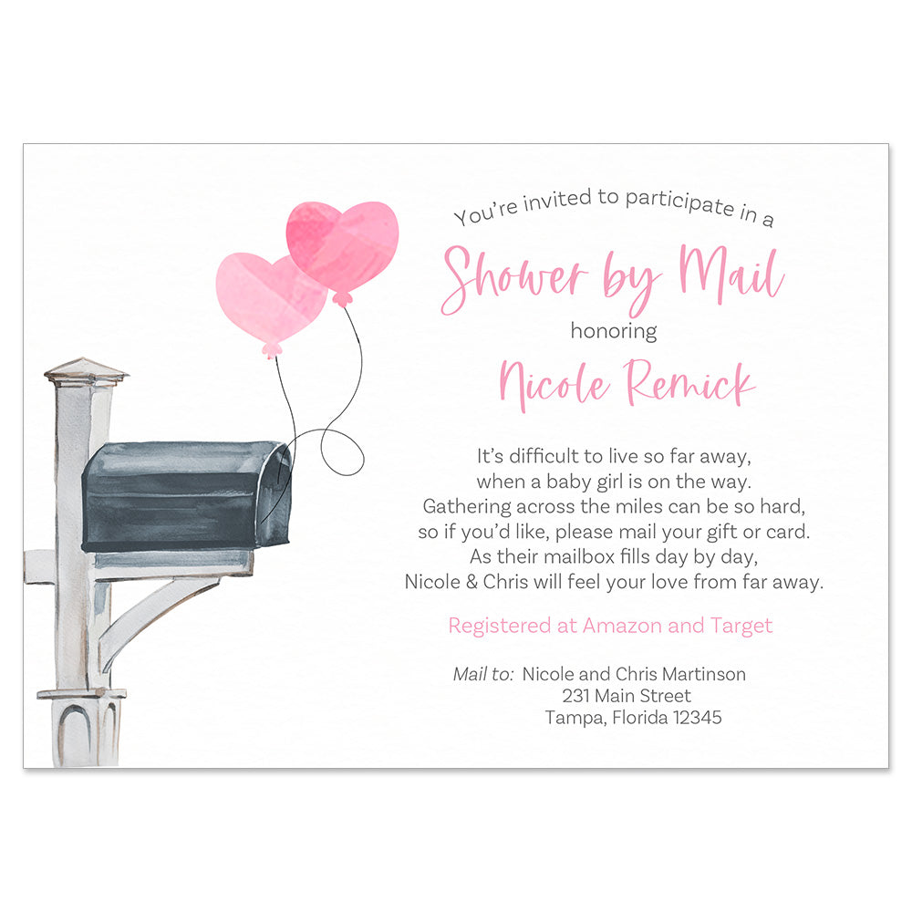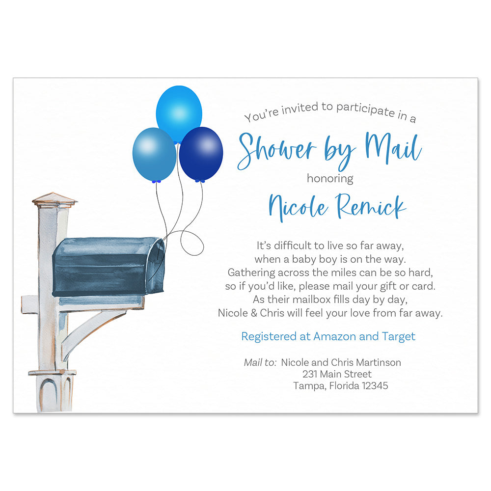 Invite guests to participate in your baby shower by mail or virtual shower with these cute invitations featuring a mailbox with balloons.