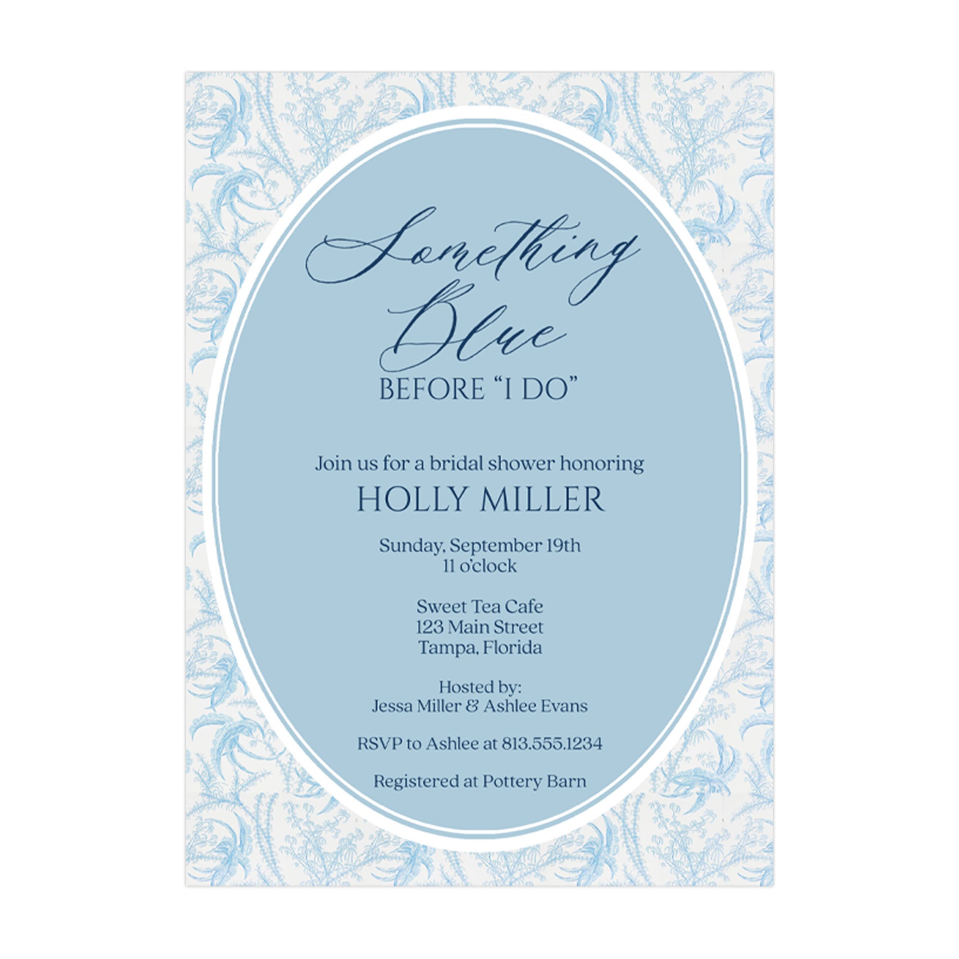 Invite guests to your bridal shower with this Victorian inspired invite featuring blue florals.