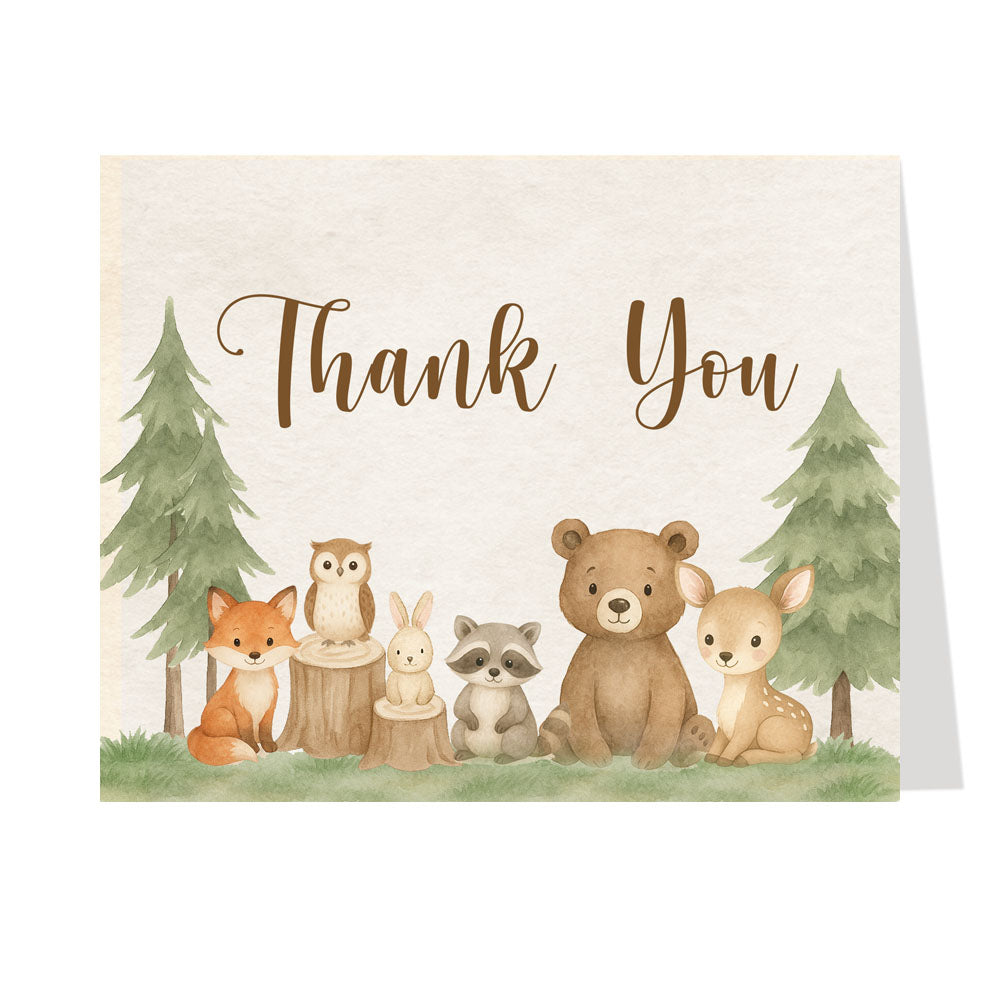 Thank guests for attending your baby shower with this fun watercolor woodland-themed thank you card featuring baby animals.