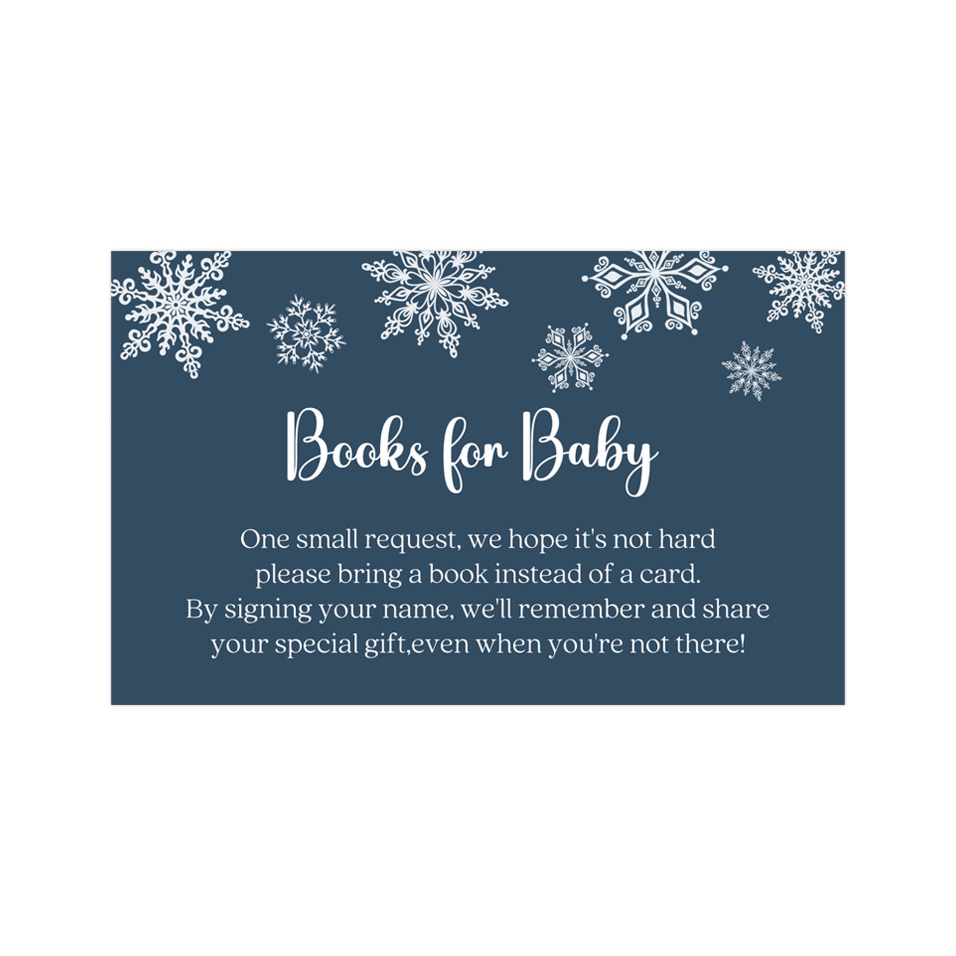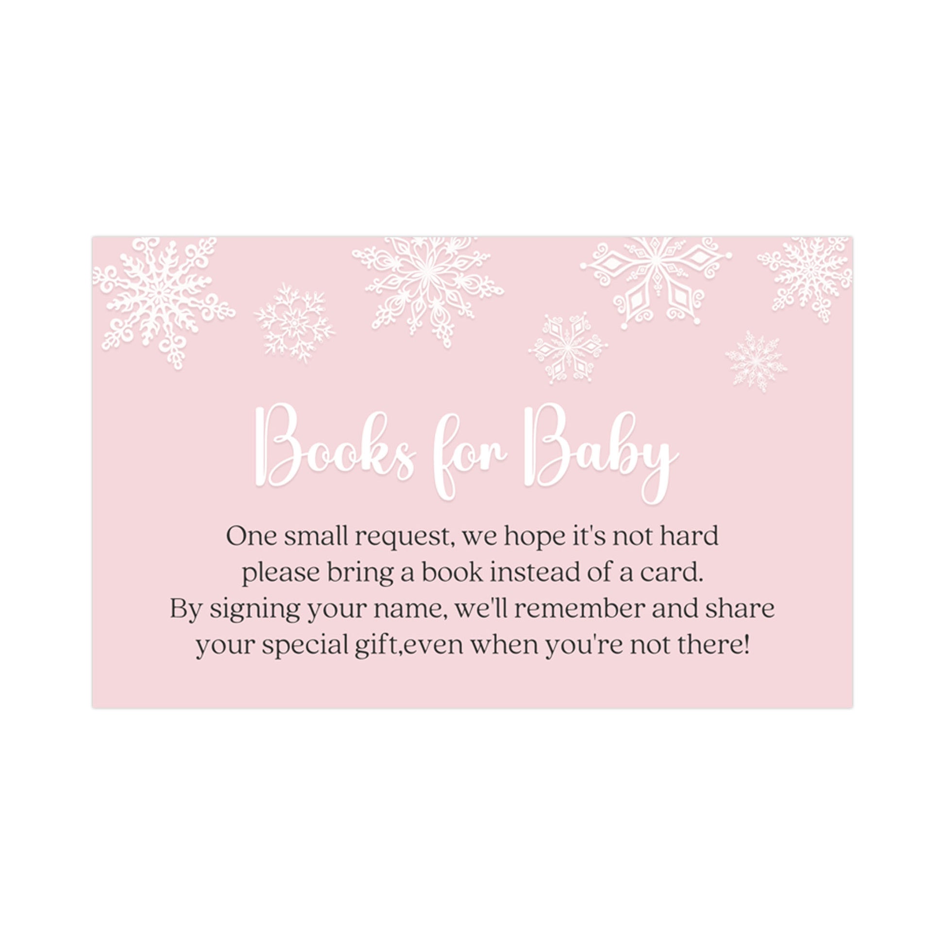 Encourage guests to bring a book to your baby shower with this pink or blue book insert featuring a snowflake background.